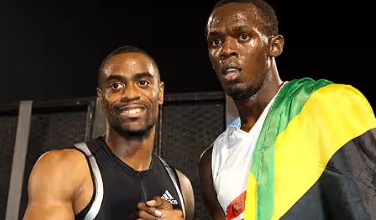 Usain Bolt (R) with Tyson Gay (L) the first time he broke the 100m world record. Image || Getty