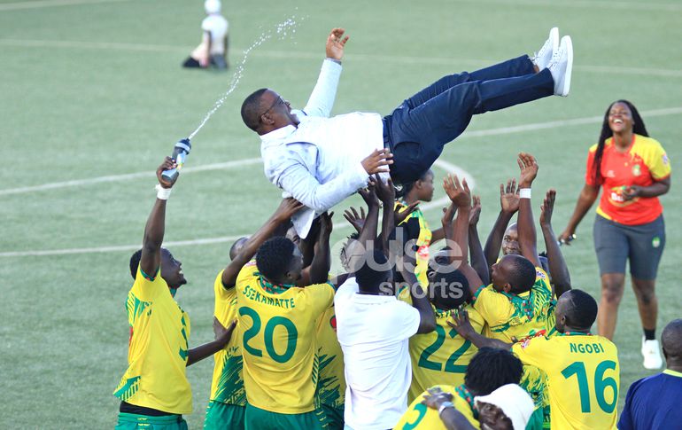 BUL FC players lift club chairman Ronald Barente after they won the FUFA Super 8 tournament on Sunday | Pulse Sports
