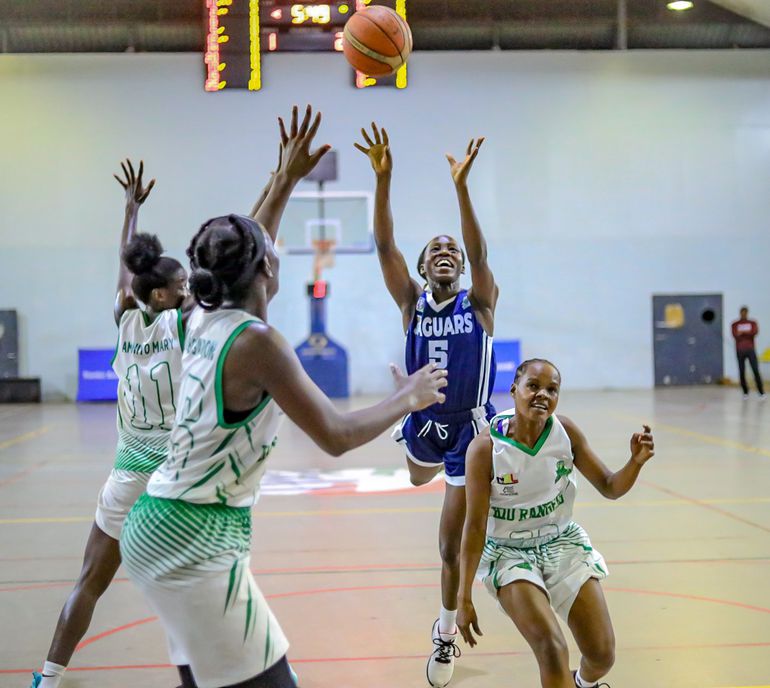 Ruth Letaru( blue) attempts to make a shot amidst pressure during their top-of-the-table clash against the KIU Rangers on Friday | FUBA image