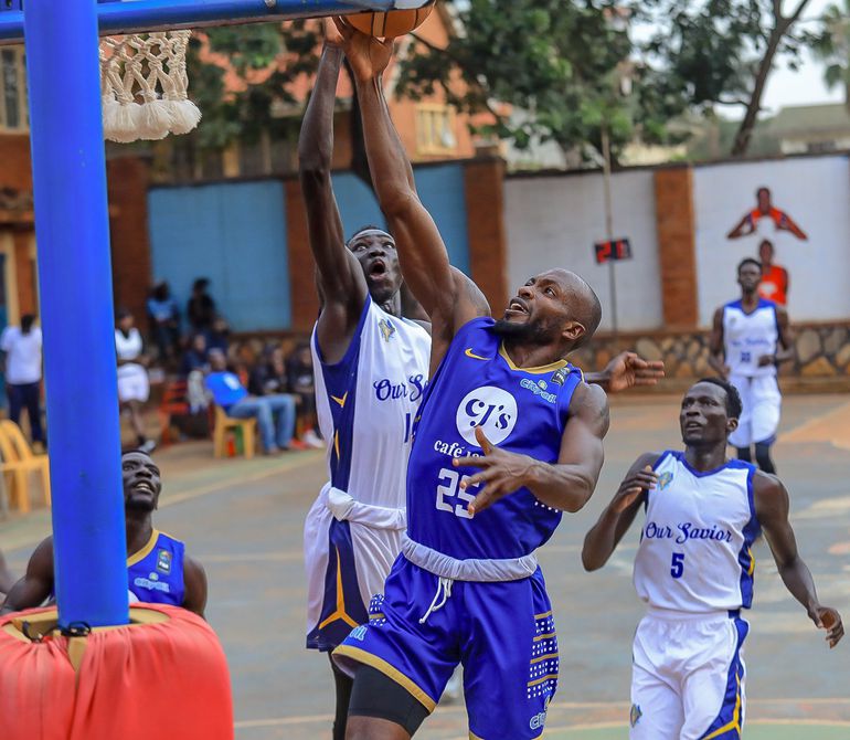 Maluel Dier (white) of Our Savior attempts to block Cesar Kizito (blue) of the City Oilers during their league game on Sunday at the YMCA court| FUBA image