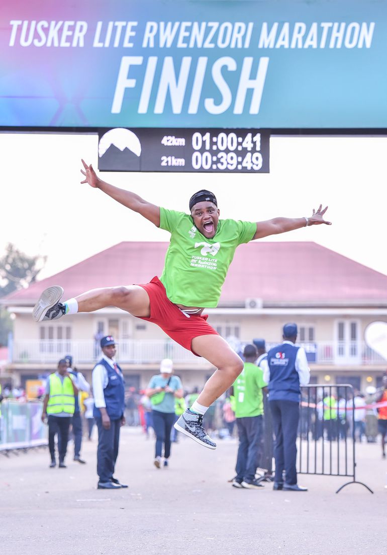 Media personality Andrew Kabuura celebrates as he finishes the Tusker Lite Rwenzori Marathon