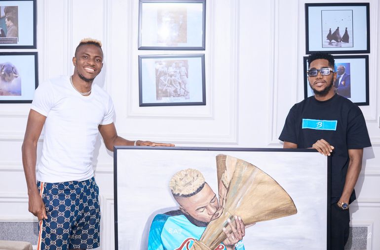 The influencer shared some photographs on his Twitter page of him and Osimhen and also a snap of the artwork presented to him.