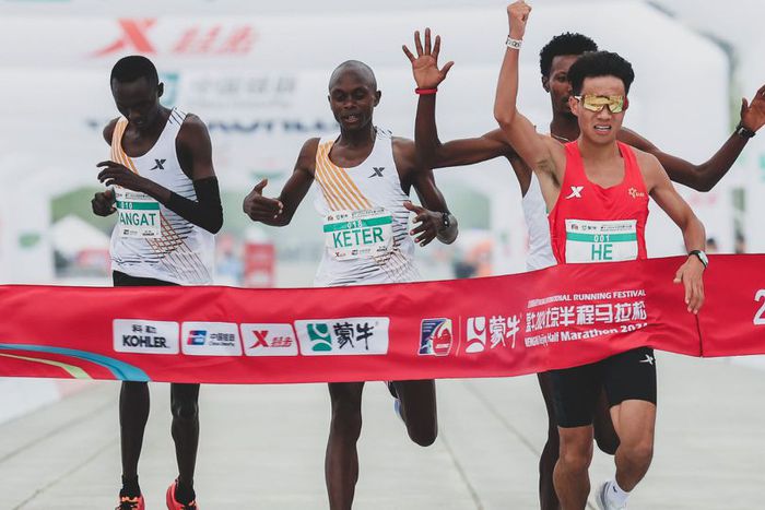 He Jie crossed the finish line with a time of 1:03.44, ahead of the Ethiopian Dejene Hailu Bikila and Kenyans Robert Keter and Willy Mnangat, who finished joint second.