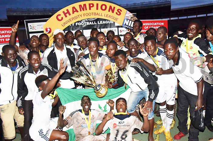 Kampala University celebrate winning the 2016 University Football League final after defeating Nkumba University| New Vision