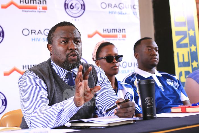 Kobs chairman Luggya Stone Tonny addressing the media on Thursday morning at Legends rugby grounds.