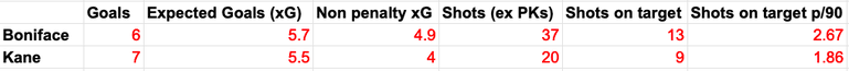 A comparison of the pair on Fbref gives an insight into both players, with Boniface’s inclination to shoot at goal evident. The Nigerian’s 38 shots (37 minus spot kicks) in the campaign’s opening five games is a Bundesliga high since records began, significantly outranking Kane’s 22 (20 excluding penalties).