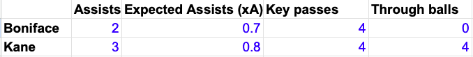 Kane’s accomplished playmaking is different class, even if Boniface is intermittently adept at fashioning chances for teammates when he opts for a pass instead of shooting.