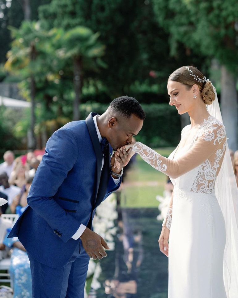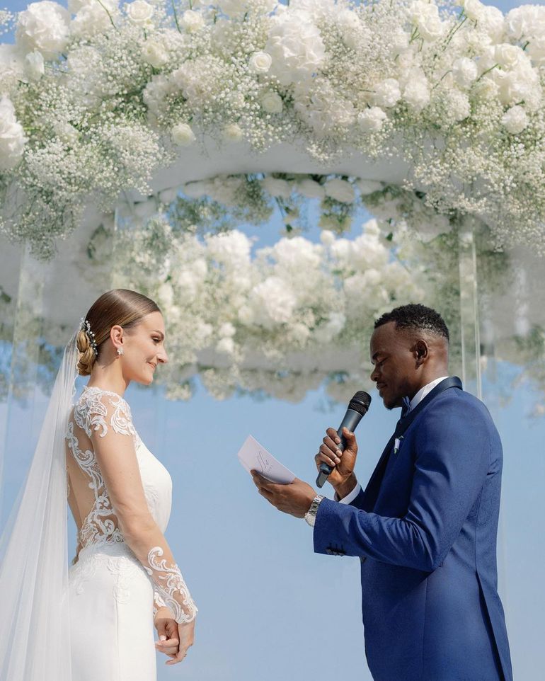 Nsofor, 36, wore a classy blue tuxedo while his wife, Anastasija Radi, walked down the aisle in ger glamorous wedding dress.