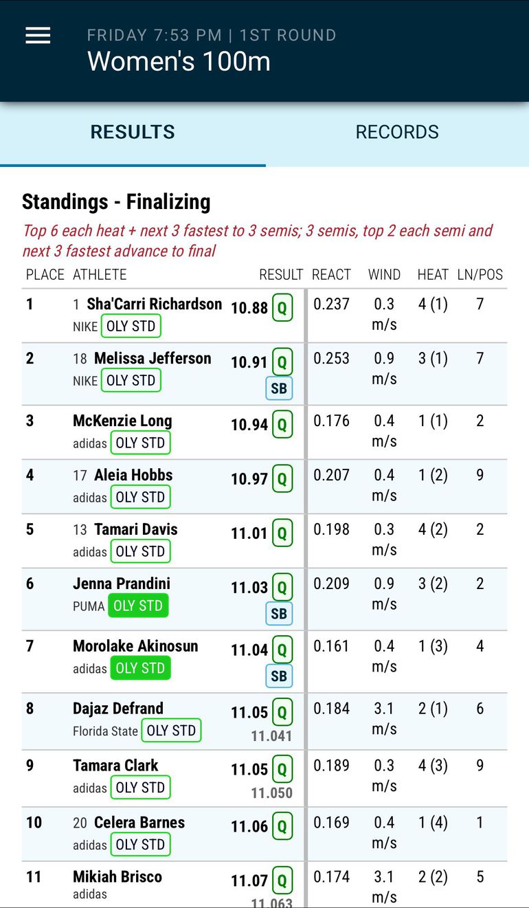 Richardson's time was the fastest across all heats as her training mate and 2022 US champion Melissa Jefferson clocked the second-fastest time of 10.91s to win her heat, while NCAA Champion Mckenzie Long was the third-fastest of 10.94s.