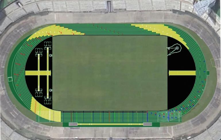 The re-laid track is adorned with the vibrant black, green, and gold colors of the Jamaican flag, and according to reports, the new surface will be from Rekortan.