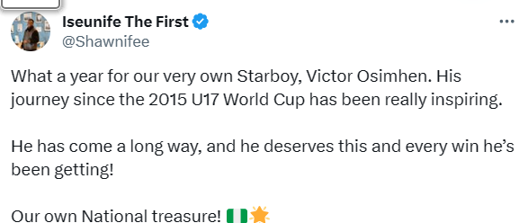 Osimhen’s award comes as a crowning achievement for what has been an excellent 12 months for club, and country and a testament to his exceptional talent.