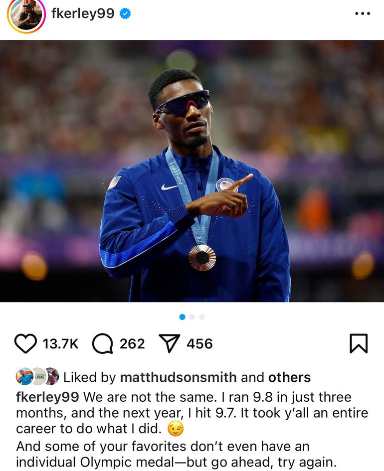“We are not the same. I ran 9.8 in just three months, and the next year, I hit 9.7. It took y’all an entire career to do what I did,” Kerley posted on Instagram.