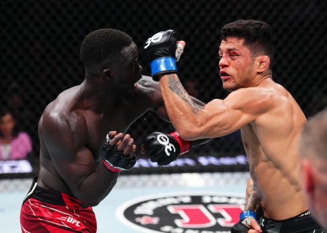 Onama channelled Nigeria’s Israel Adesanya’s famous arrow celebration. Adesanya triumphed over Alex Pereira, also a Brazilian, for the Middleweight title.