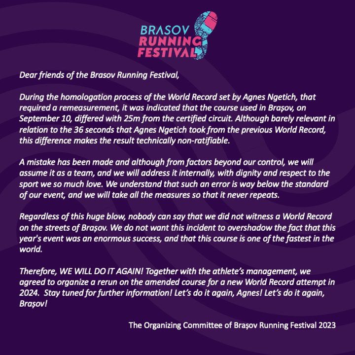 A part of the lengthy post on Facebook read: “During the homologation process of the World Record set by Agnes Ngetich, that required a remeasurement, it was indicated that the course used in Brasov, on September 10, differed with 25m from the certified circuit.