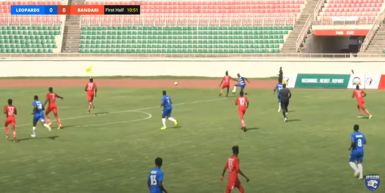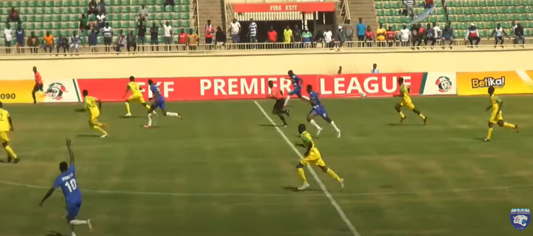 The ball finds Cliff Nyakeya on the other side of the pitch, before Nyakeya cuts it back for a late third man runner (Brian Wanyama who is not in the image yet) in the box