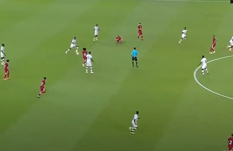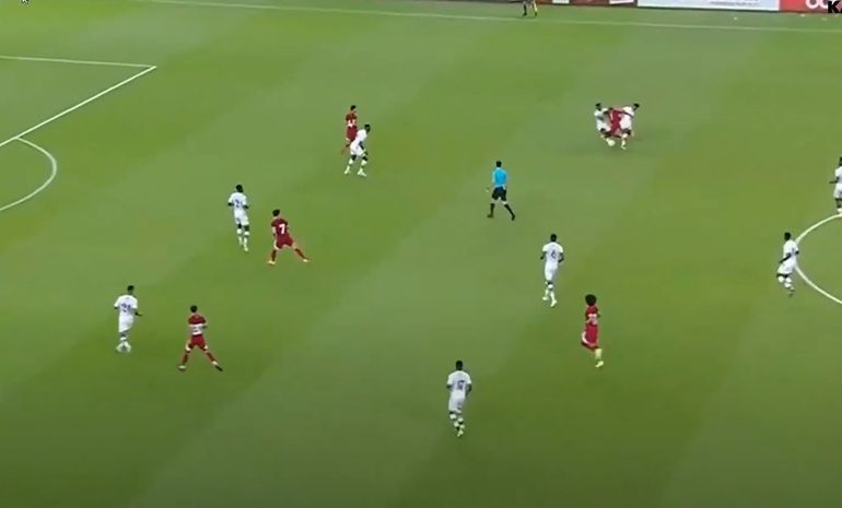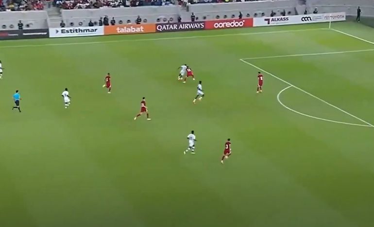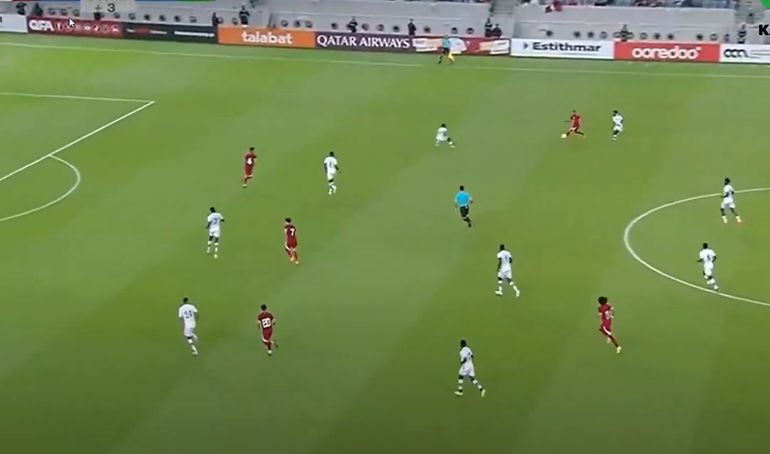 Against Qatar, left back Eric ‘Marcelo’ Ouma finds him with a well executed left-footed pass from deep, which lands onto the pat of Olunga as shown below.