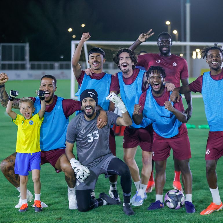 Al-Kholood players celebrated during a training session with the son of William Troost-Ekong.
