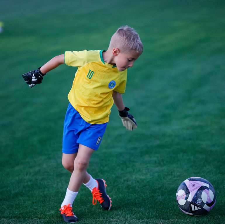The image, taken at night under bright stadium lights, shows the child participating in the celebration alongside the team, who were dressed in blue training vests and maroon shorts.