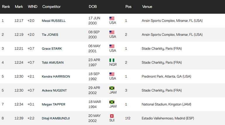 This shows the women's 100mH is arguably the most anticipated event ahead of Tokyo, with no clear pundits' favourite for the world title, having close to seven women, including the Jamaican trio of Megan Tapper, Ackera Nugent, and reigning world champion Danielle Williams, capable of challenging for the gold medal or even breaking Amusan's world record of 12.12s.