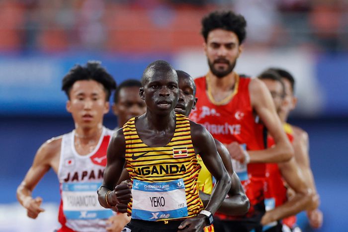 Dismas from Ndejje University wins Gold in the men's 10,000m final at the Shuangliu Sports Centre Stadium.