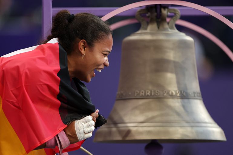 Ogunleye's win was celebrated with jubilant scenes as she draped the German flag around her shoulders and rang the victory bell.