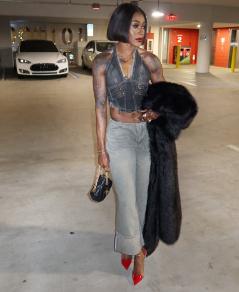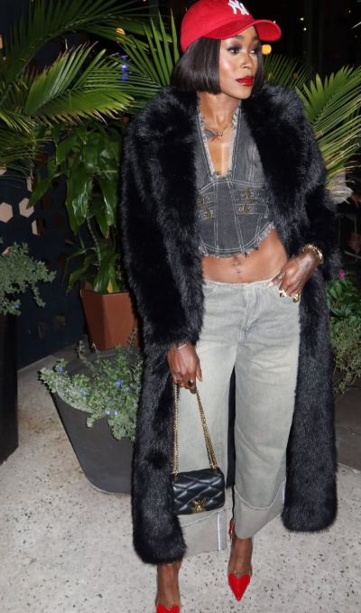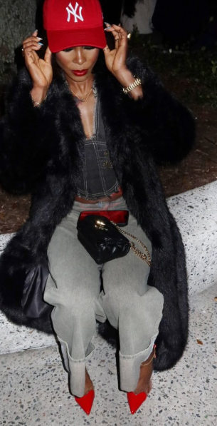 Elaine wore a set of pants and a top, both denims then added a black fur coat to stir up the look. She paired the look with red heels and a black purse to complete her outfit for the night. A lover of bob wigs, she added a red cap to spice things up.